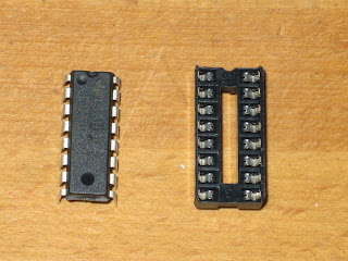 Now do the same with the 14 pin socket. Notice the orientation of the sockets with the semicircular indentations toward the top of the PCB.